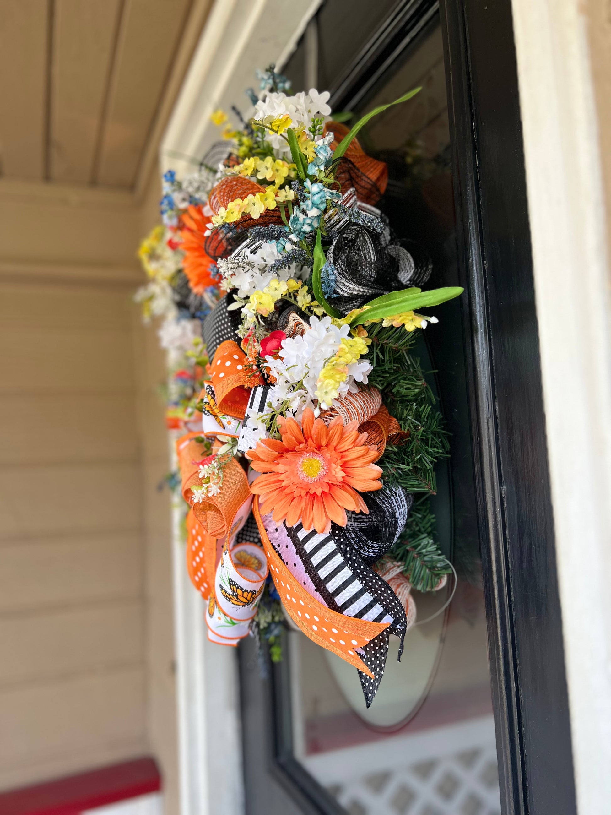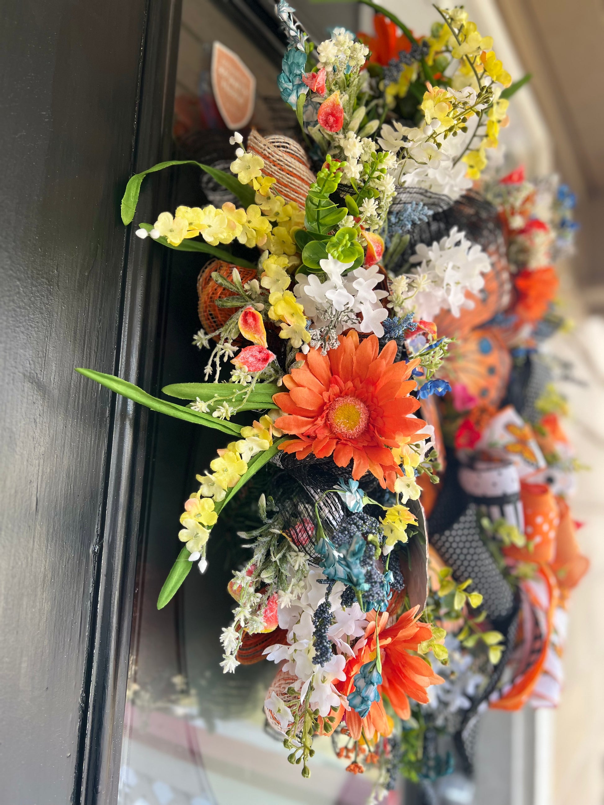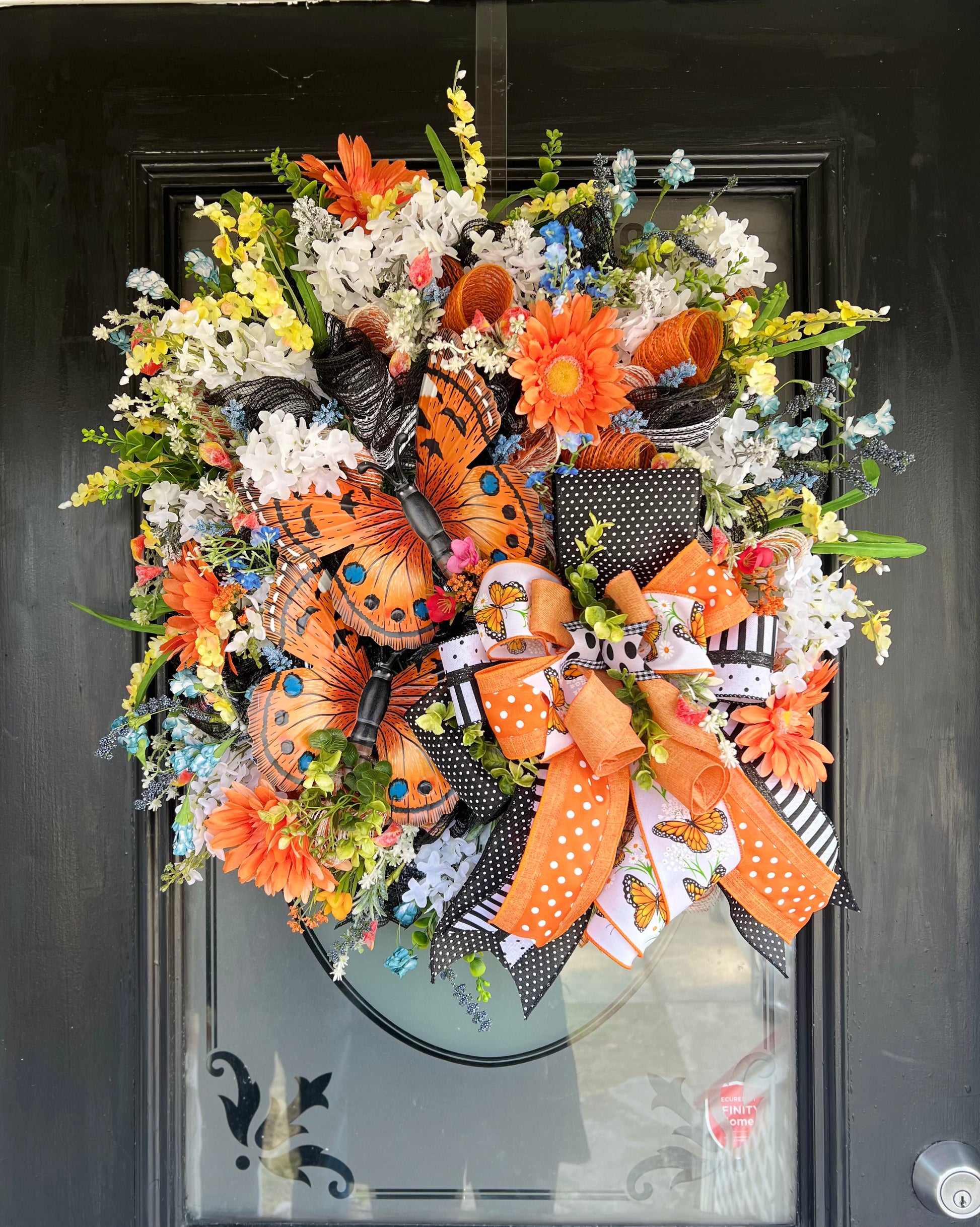 This beautiful wreath features 2 delicate butterflies nestled among a bed of vibrant florals, all tied together with a lovely bow. Add a touch of nature and elegance to your home decor with Butterflies.
