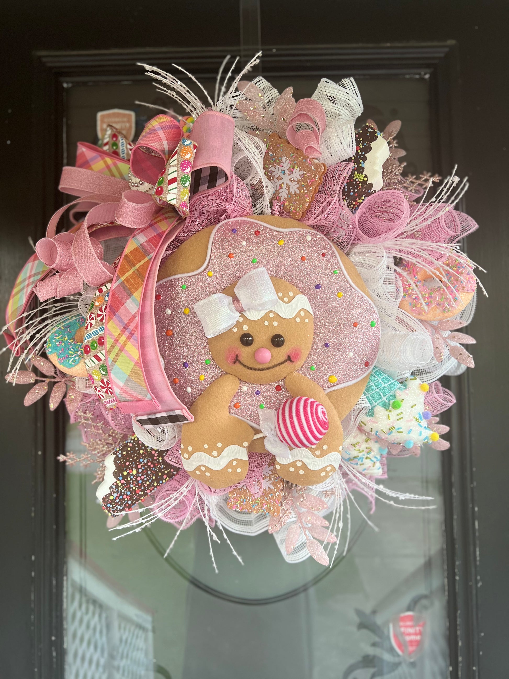 A gingerbread holiday wreath is a charming festive decoration made from spiced gingerbread cookies, often shaped into a circular design. Adorned with colorful icing, candy, and seasonal embellishments, it captures the warmth and joy of the holiday season.