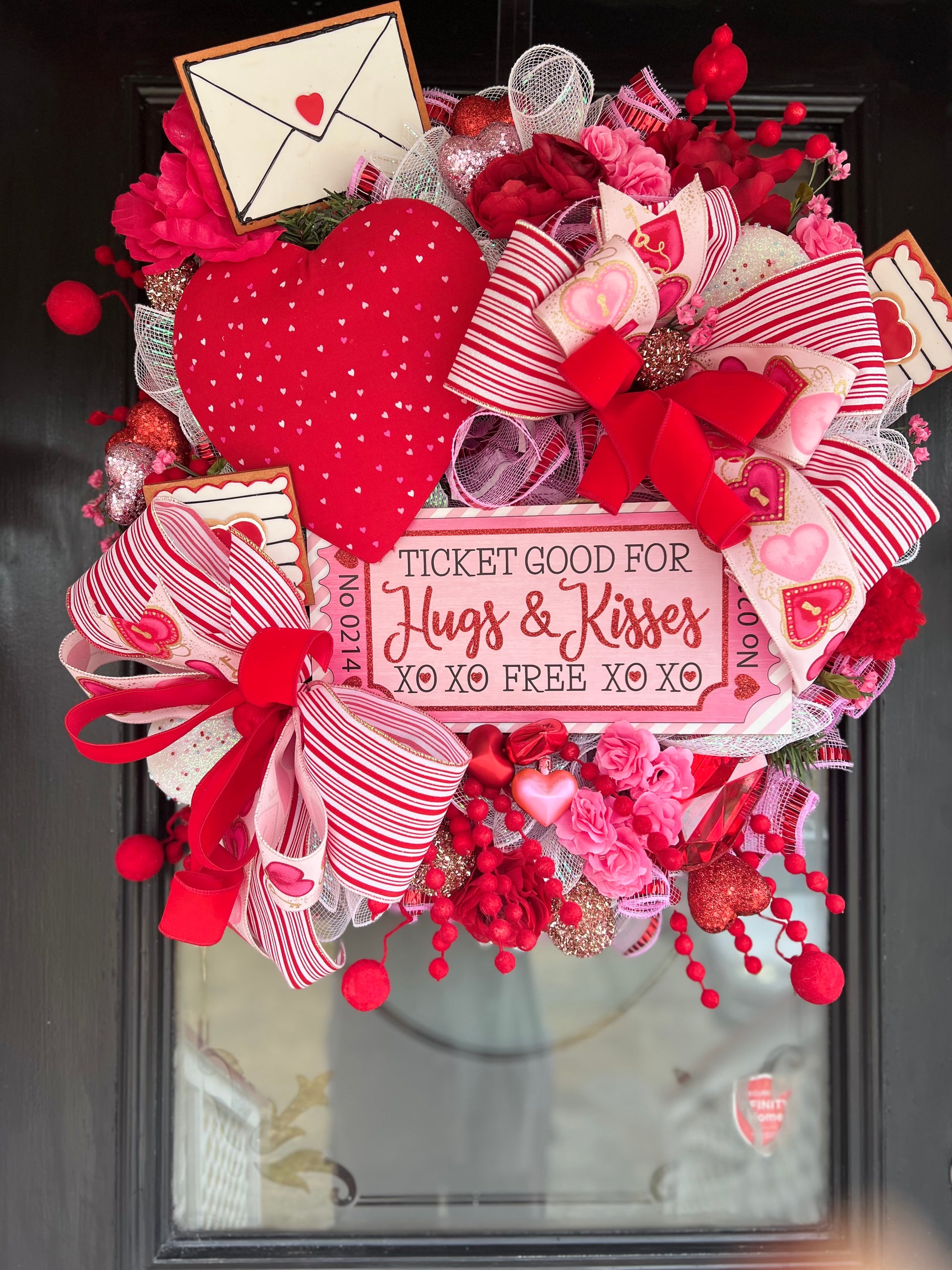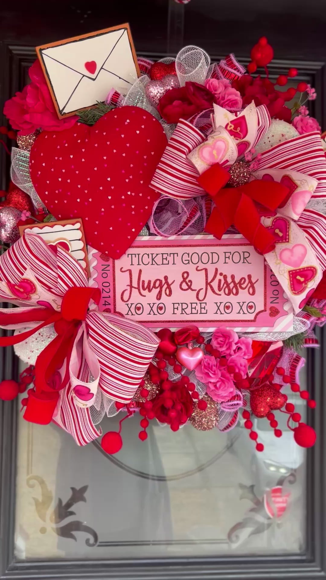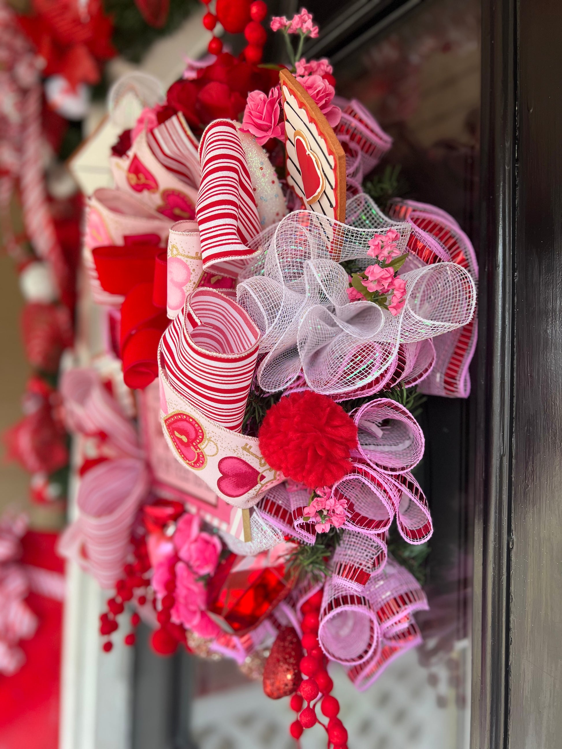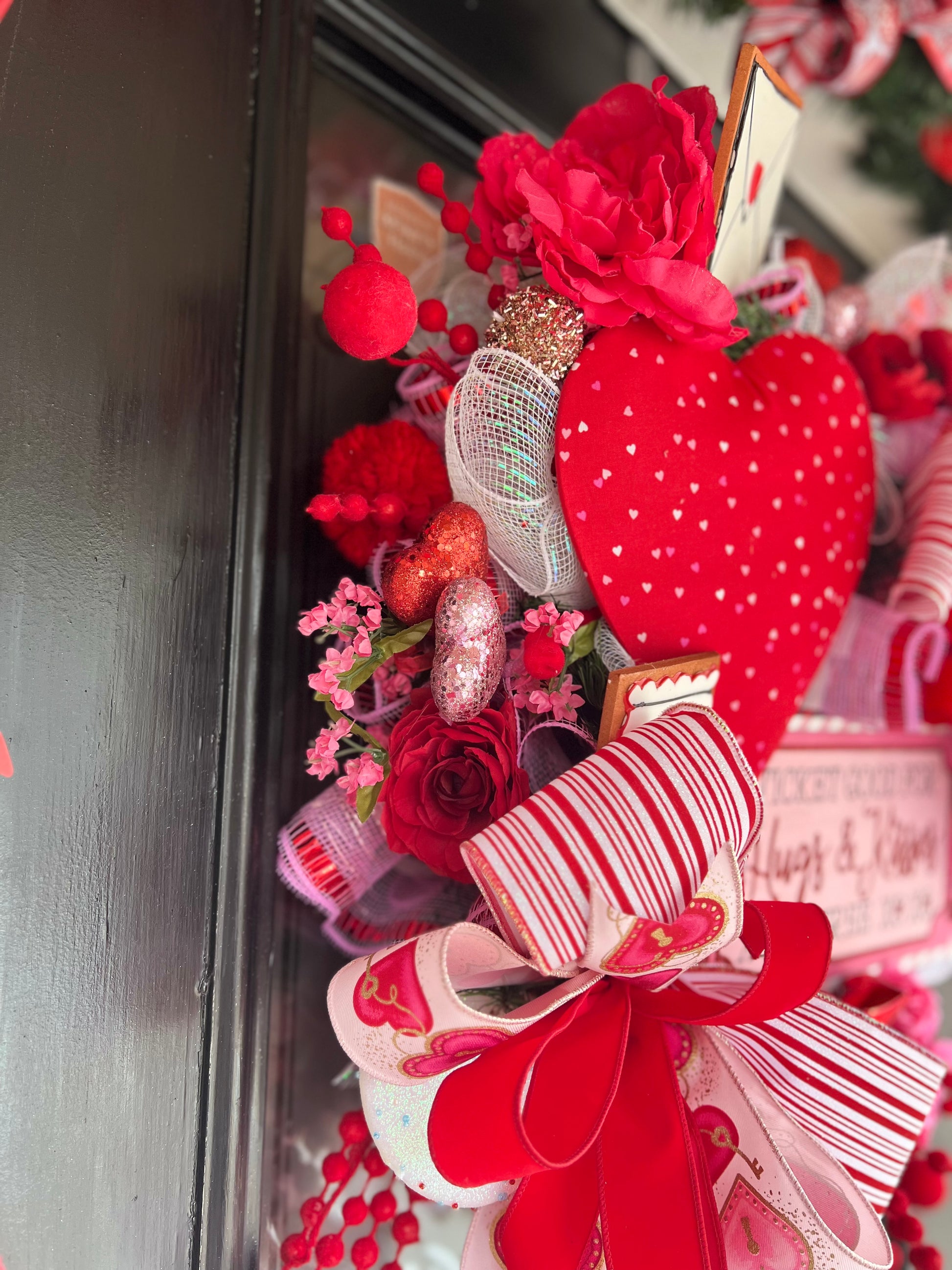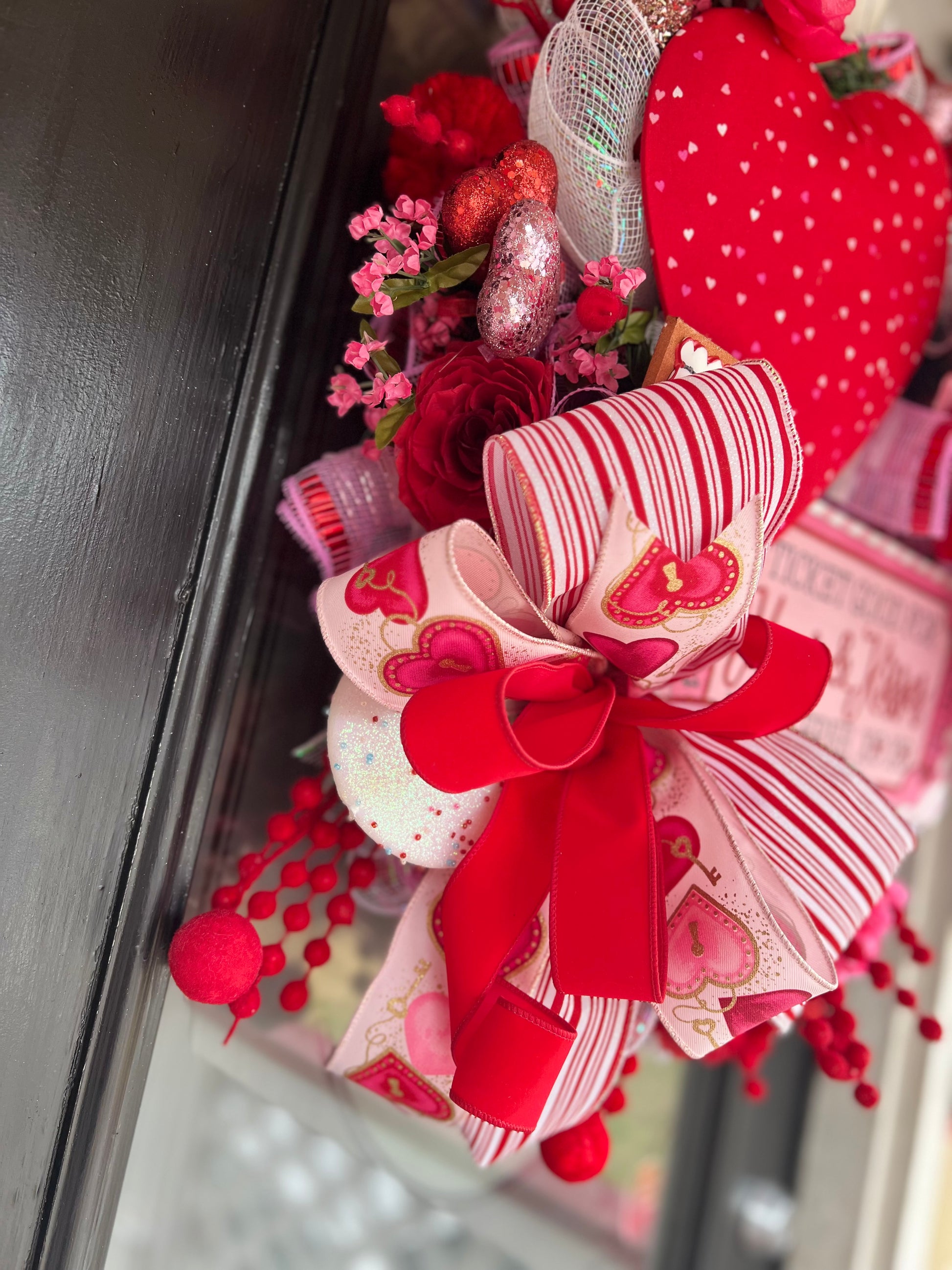 Hugs & Kisses is a stunning red and pink wreath adorned with 2 big bows. Show your love with this beautiful piece. Perfect for Valentine's Day or any special occasion. Made with care and attention to detail, it's a wonderful way to express your affection.