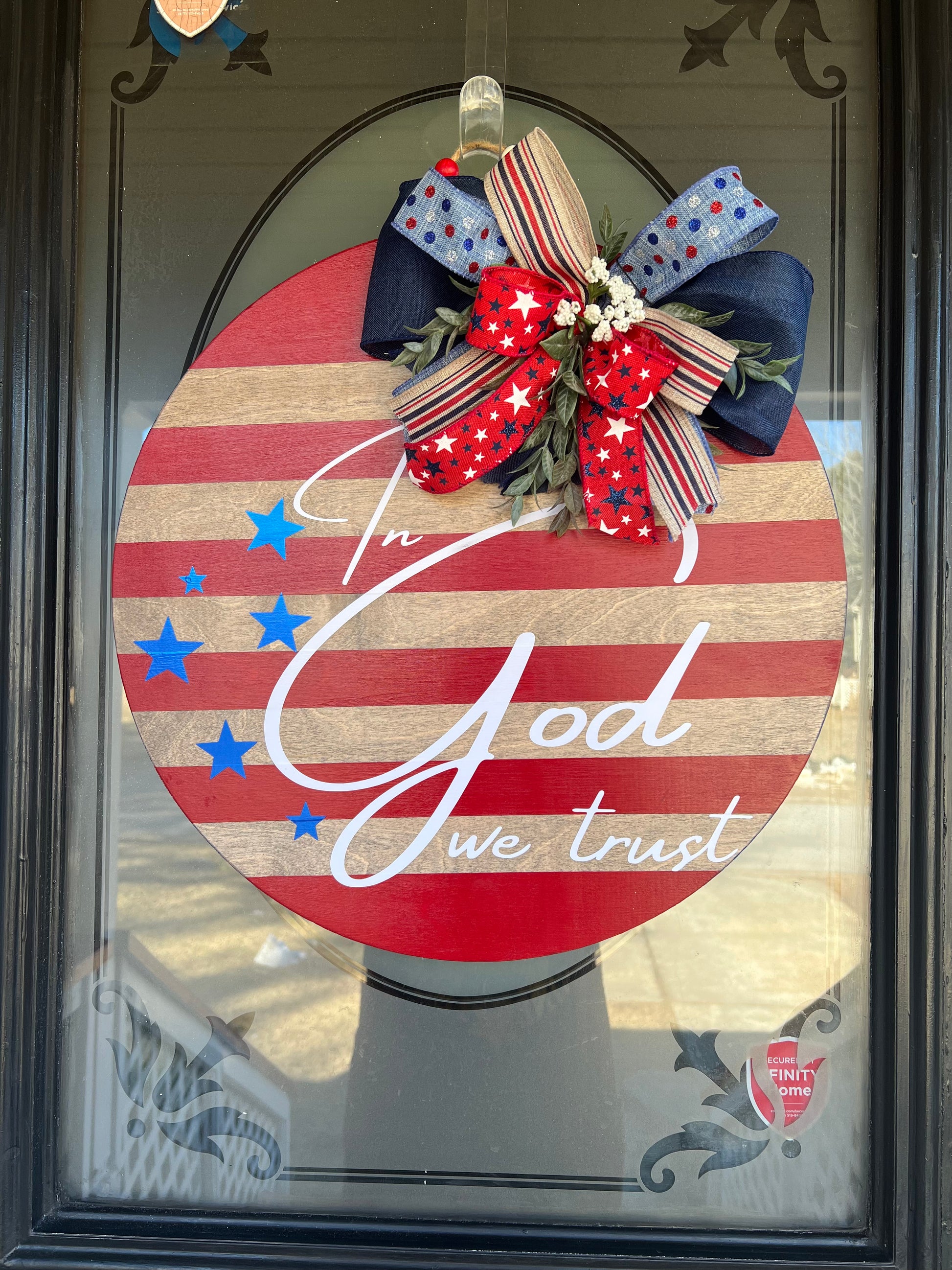 Add some patriotic charm to your home with "In God We Trust" Fourth of July 18" wood sign. Featuring a sparkly festive bow and a touch of greenery. Show your pride and celebrate Independence Day with this beautiful sign.