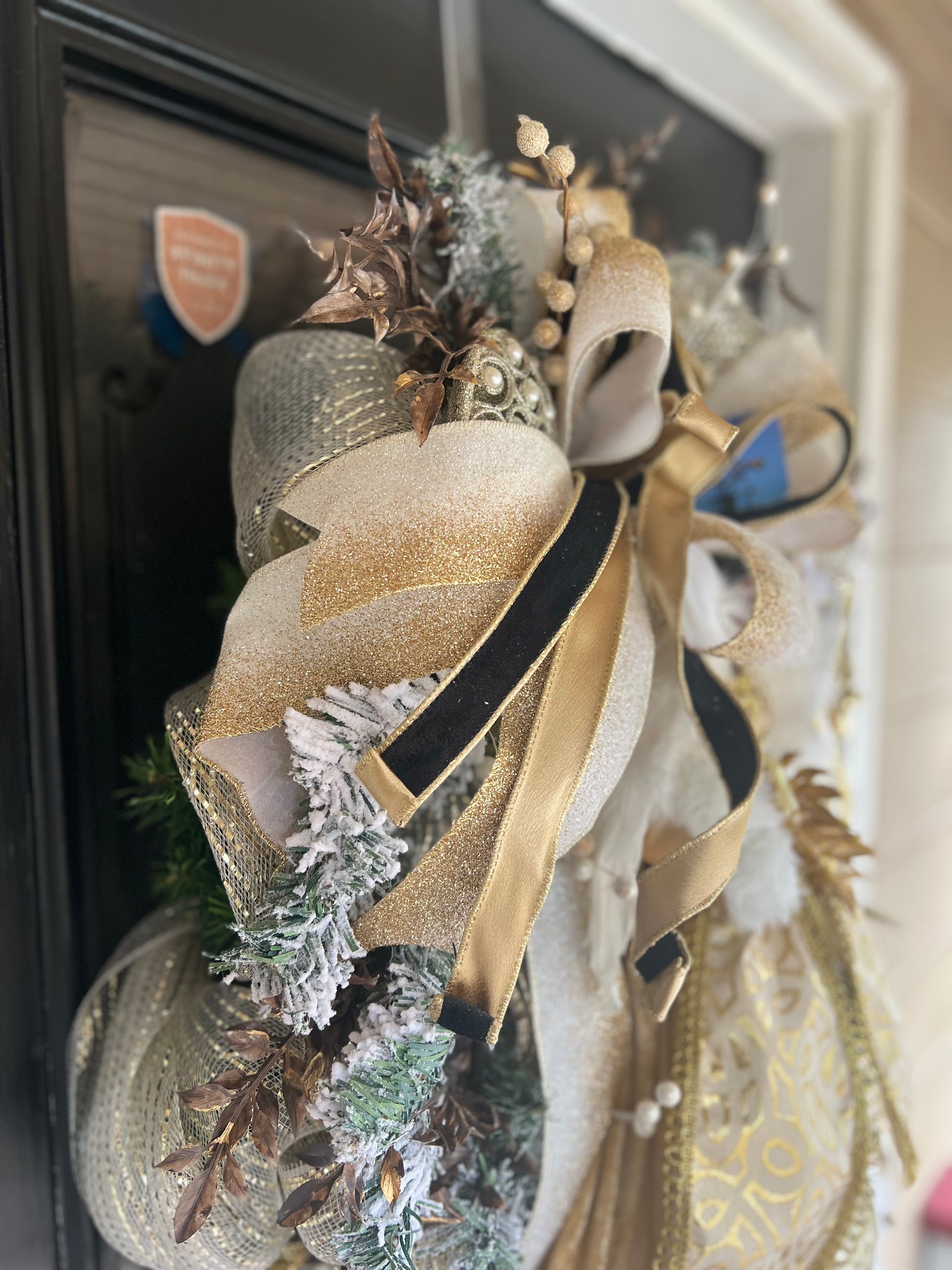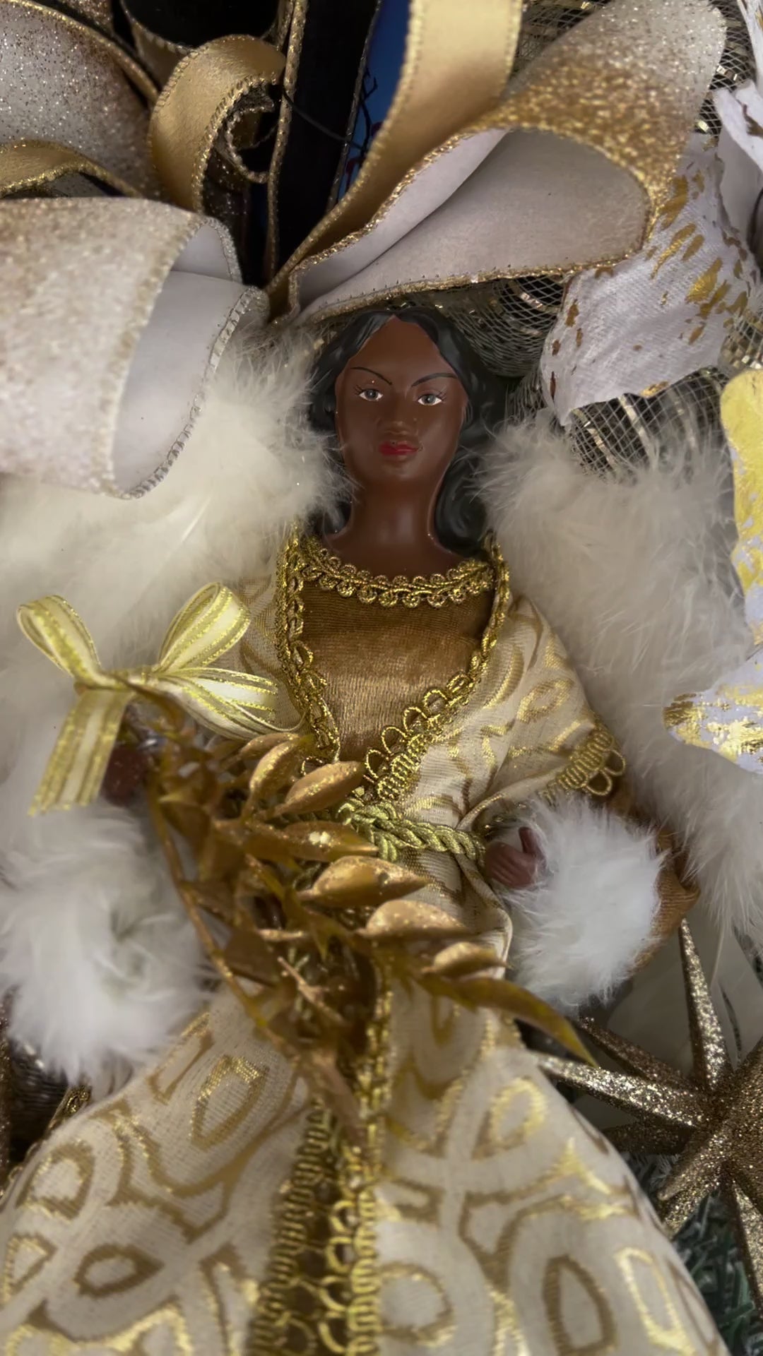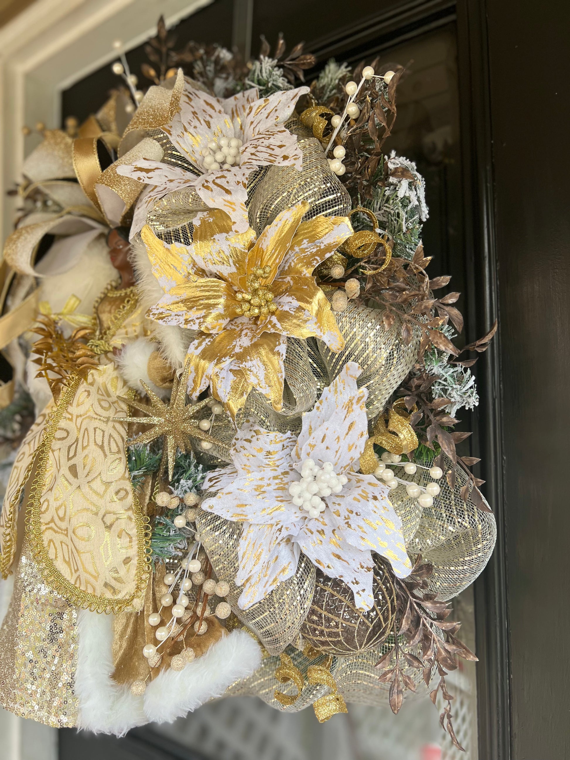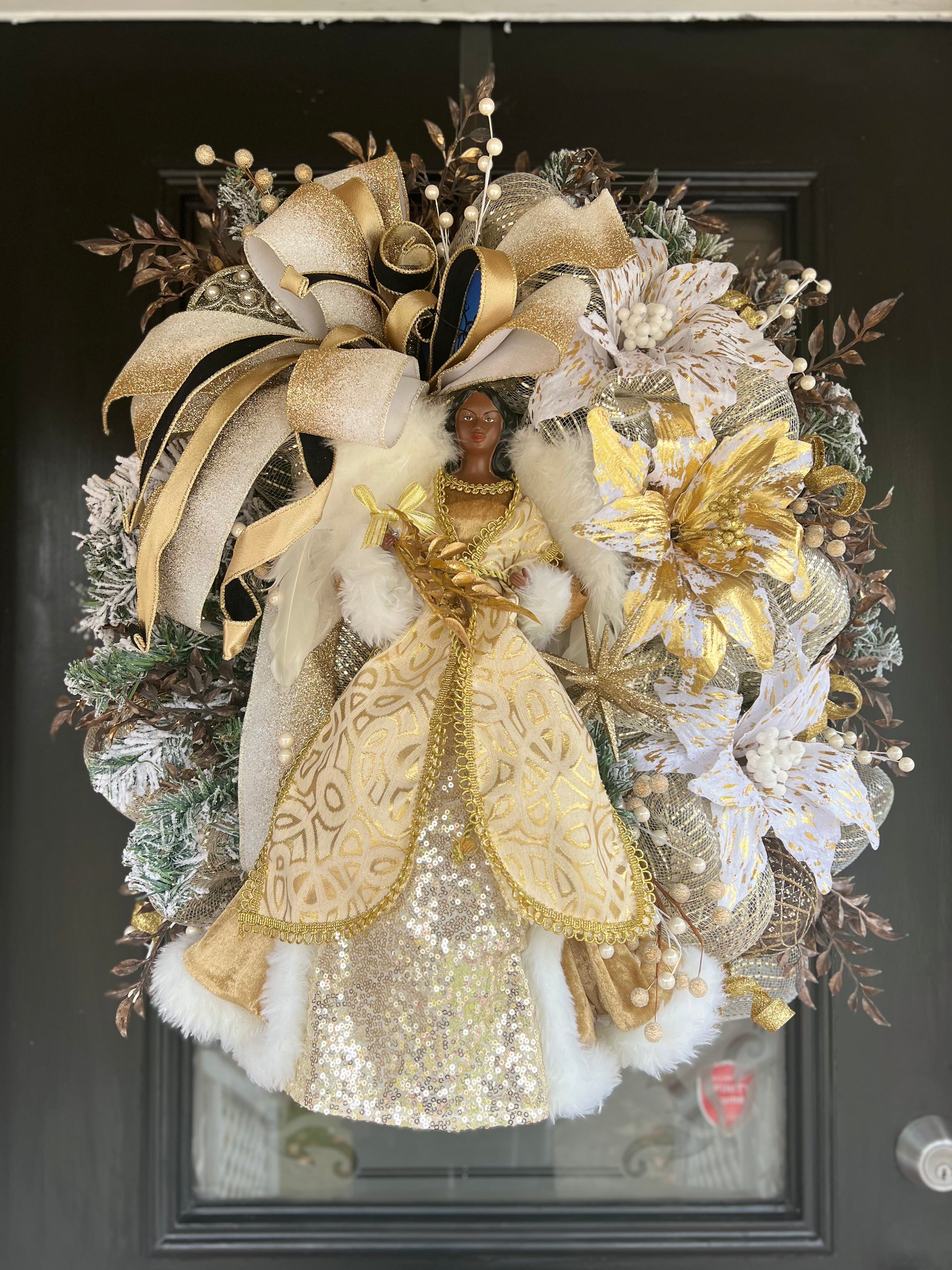 This beautiful Mother Angel wreath features a delicate blend of gold and white ribbon and vibrant poinsettias. A stunning way to honor and remember a cherished mother figure. Add a symbol of love and remembrance to any holiday decor.