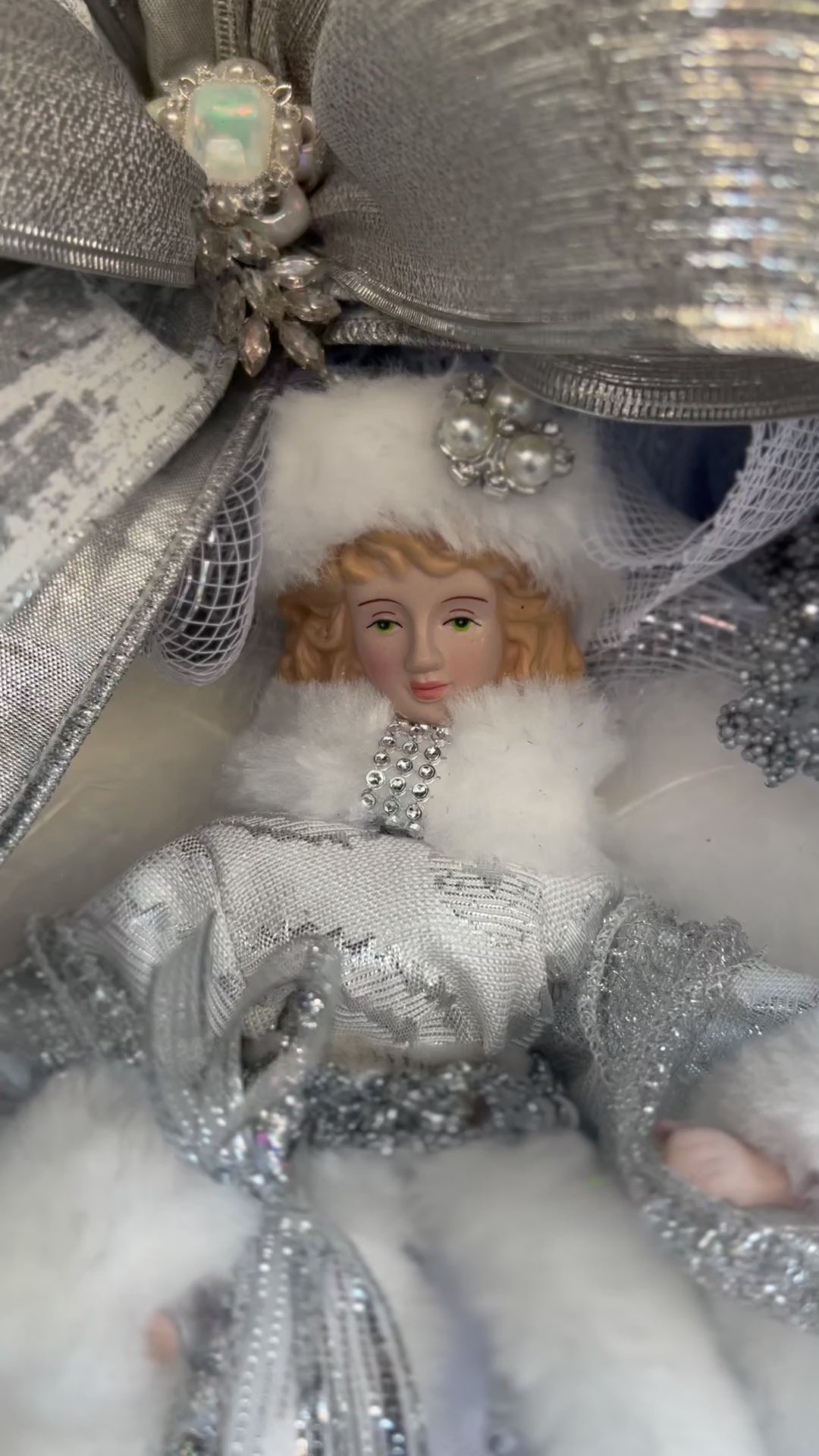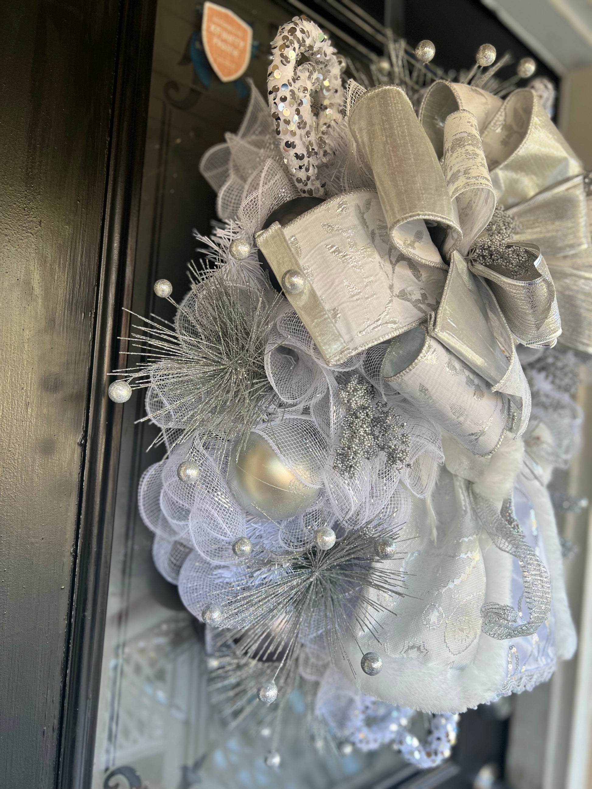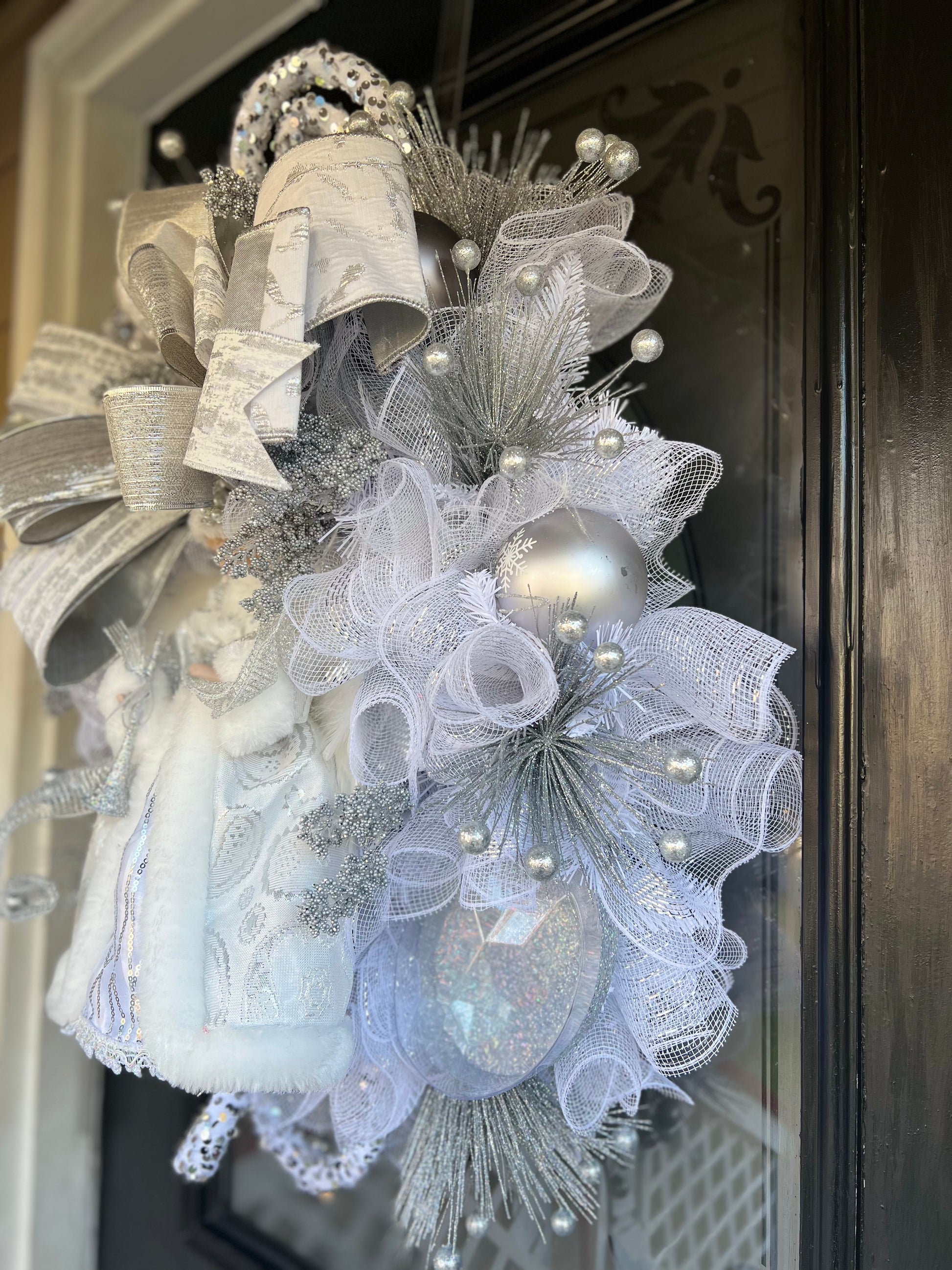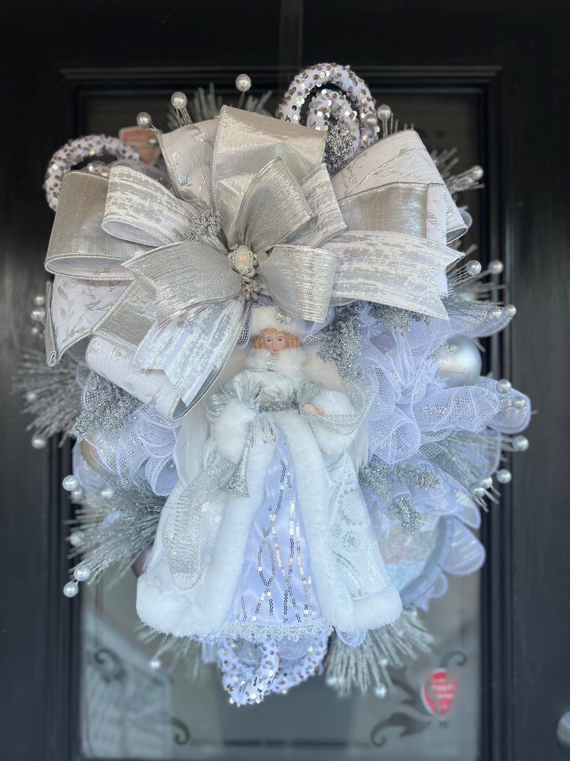 Experience the beauty and grace of our Silver Angel wreath. This stunning wreath features a silver and white color palette, adorned with a delicate big bow and various elegant embellishments. Perfect for adding a touch of celestial charm to any space.